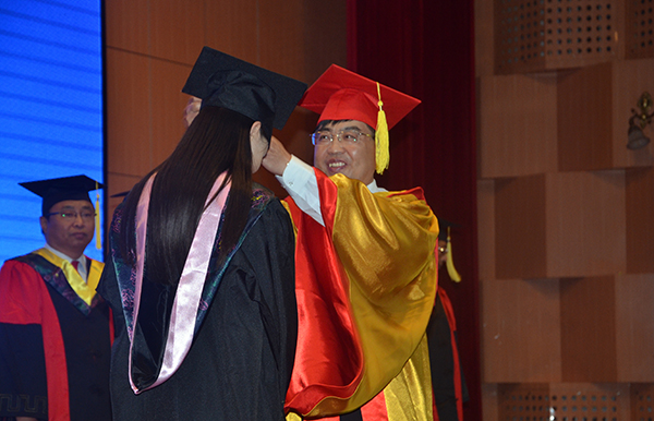 毕业典礼结束后,学位委员会主席、院长张凤武长为获得学士学位的同学行拨穗礼并颁发学位证书。