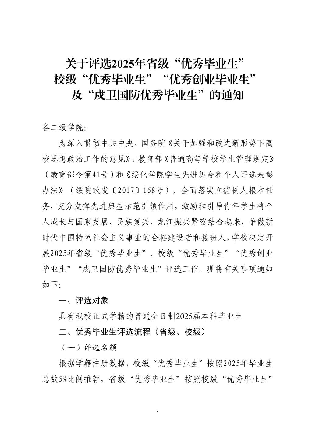 关于评选2025年省级优秀毕业生、校级优秀毕业生、优秀创业毕业生及戍卫国防优秀毕业生的通知